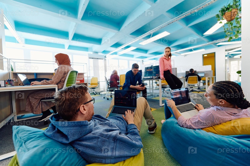В современном офисе стартапа разнообразная группа молодых и способных бизнесменов ведет оживленные обсуждения различных проектов, демонстрируя командную работу, инновации и предпринимательский дух