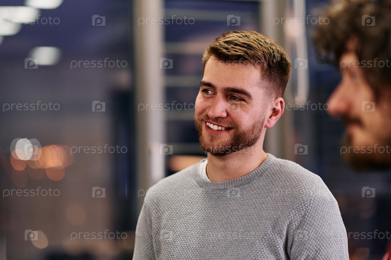 Крупный план европейского бизнесмена, общающегося с коллегами в офисе