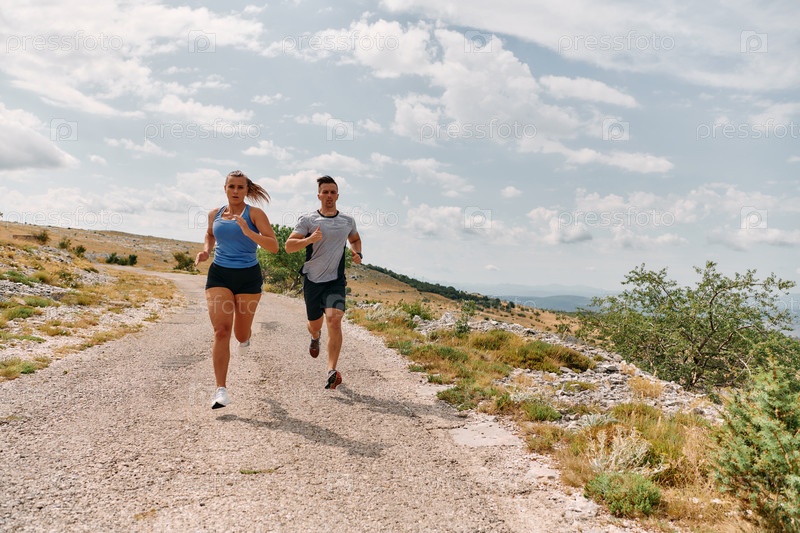 Пара в спортивной одежде бежит по живописной дороге во время утренней тренировки, наслаждаясь свежим воздухом и поддерживая здоровый образ жизни