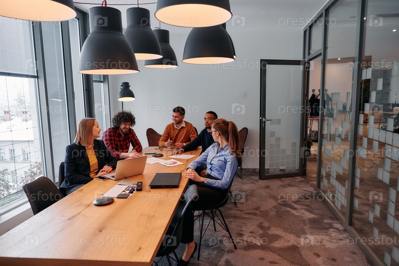 Динамичная предпринимательская команда, разрабатывающая стратегии проектов на встрече в современном офисе