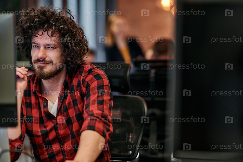 Сосредоточенный программист с афро-прической в клетчатой рубашке работает на компьютере в офисной среде