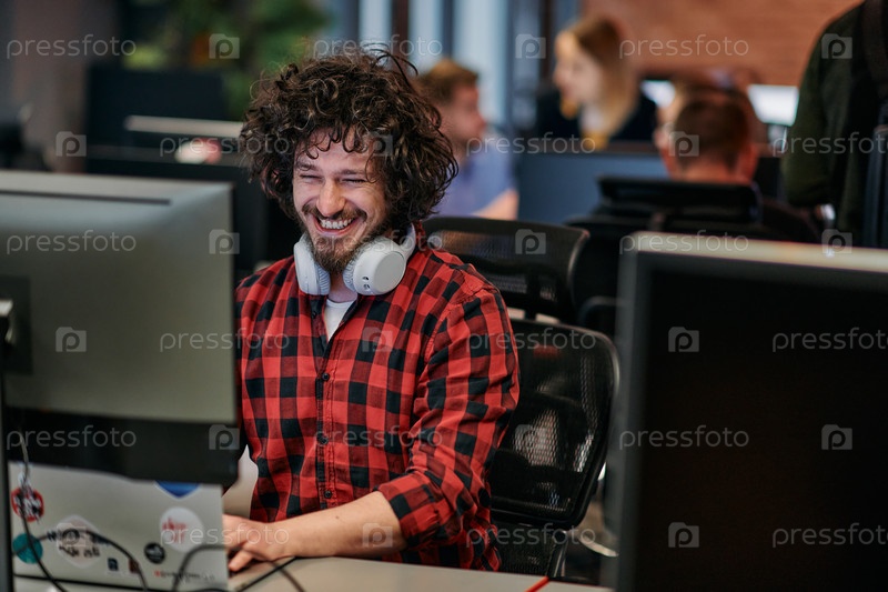 Сосредоточенный программист с афро-прической в клетчатой рубашке работает на компьютере в офисной среде