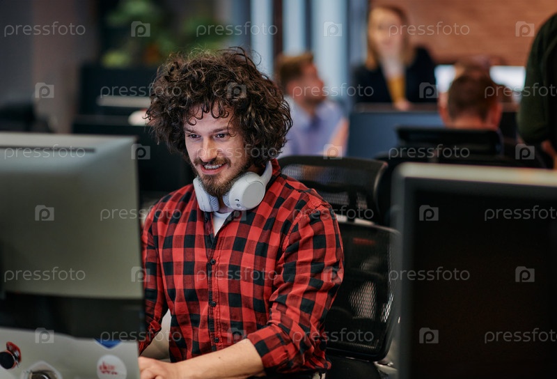 Сосредоточенный программист с афро-прической в клетчатой рубашке работает на компьютере в офисной среде