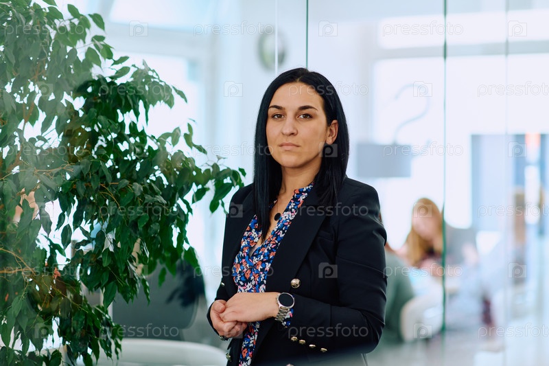 Портрет уверенной в себе деловой женщины со скрещенными руками в офисной обстановке