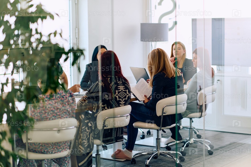 Разнообразная бизнес-группа обсуждает проекты в современном стеклянном офисе