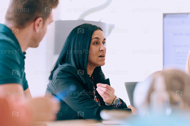 Разнообразная бизнес-группа обсуждает проекты в современном стеклянном офисе
