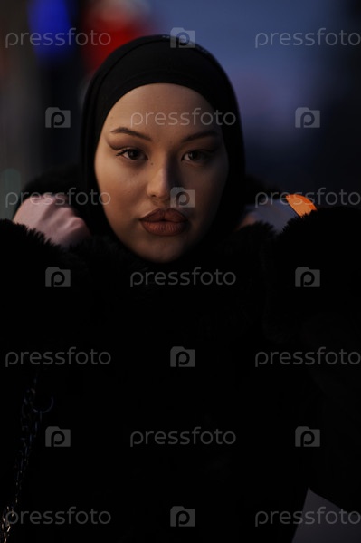 Мусульманка идет по городской улице холодной зимней ночью в хиджабе