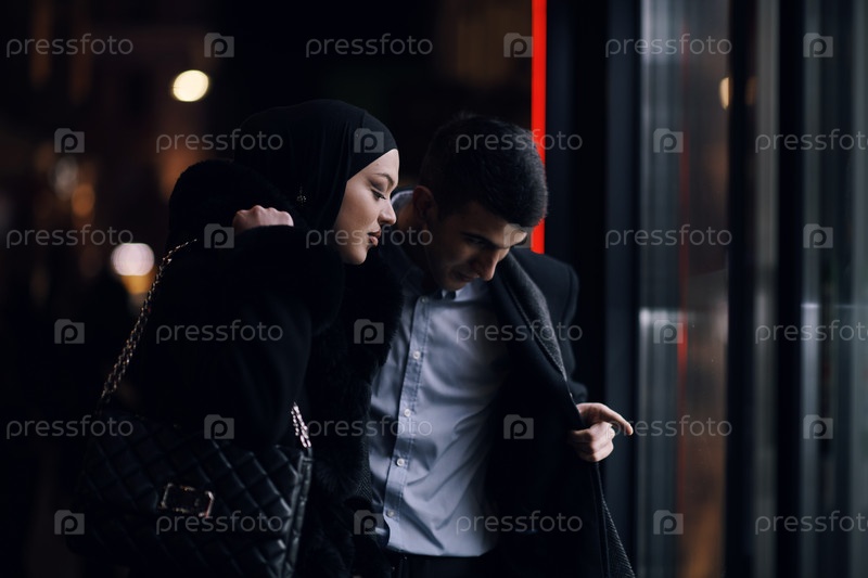 Счастливая мультикультурная деловая пара прогуливается вместе на улице города ночью возле витрины ювелирного магазина
