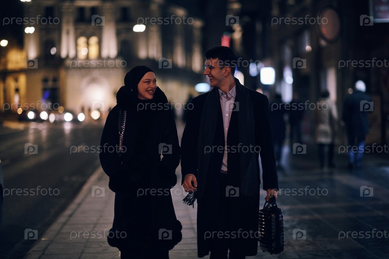 Счастливая мультикультурная деловая пара прогуливается вместе на улице города ночью возле витрины ювелирного магазина