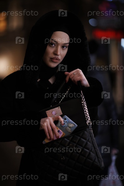 Мусульманка идет по городской улице холодной зимней ночью в хиджабе