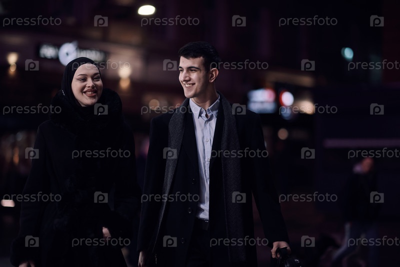Счастливая мультикультурная деловая пара прогуливается вместе на улице города ночью возле витрины ювелирного магазина