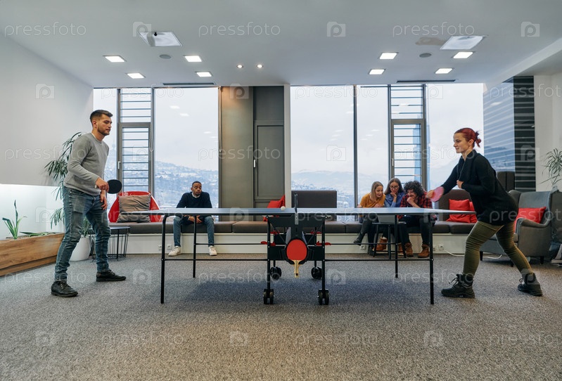 Коллеги по бизнесу отдыхают от работы, чтобы поиграть в настольный теннис, способствуя командной работе и товариществу на рабочем месте