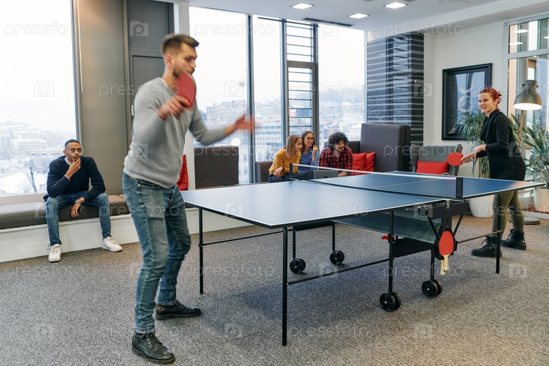 Коллеги по бизнесу отдыхают от работы, чтобы поиграть в настольный теннис, способствуя командной работе и товариществу на рабочем месте