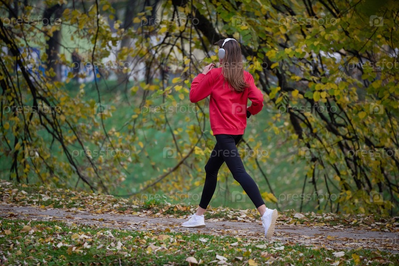 Молодая красивая женщина бежит в осеннем парке и слушает музыку в наушниках на смартфоне