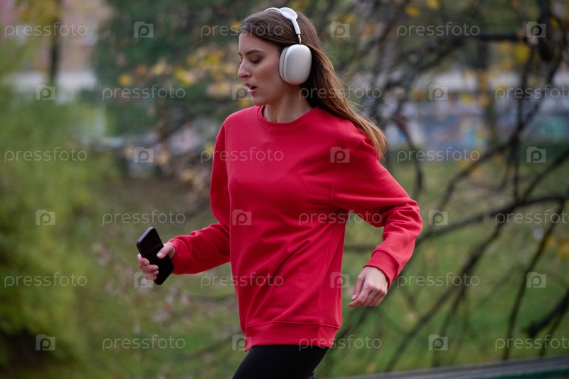 Молодая красивая женщина бежит в осеннем парке и слушает музыку в наушниках на смартфоне