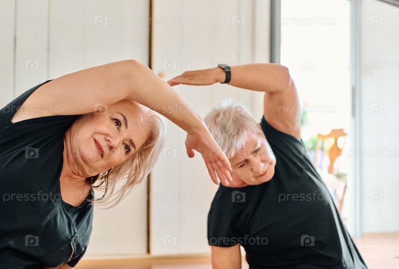 Группа пожилых женщин занимается различными упражнениями йоги, включая растяжку шеи, спины и ног, под руководством тренера в залитом солнцем месте, способствуя благополучию и гармонии