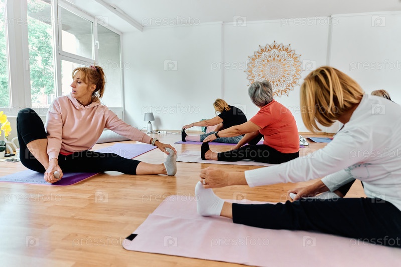Группа пожилых женщин занимается различными упражнениями йоги, включая растяжку шеи, спины и ног, под руководством тренера в залитом солнцем месте, способствуя благополучию и гармонии