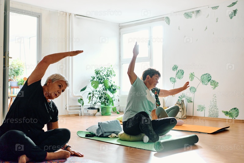 Группа пожилых женщин занимается различными упражнениями йоги, включая растяжку шеи, спины и ног, под руководством тренера в залитом солнцем месте, способствуя благополучию и гармонии