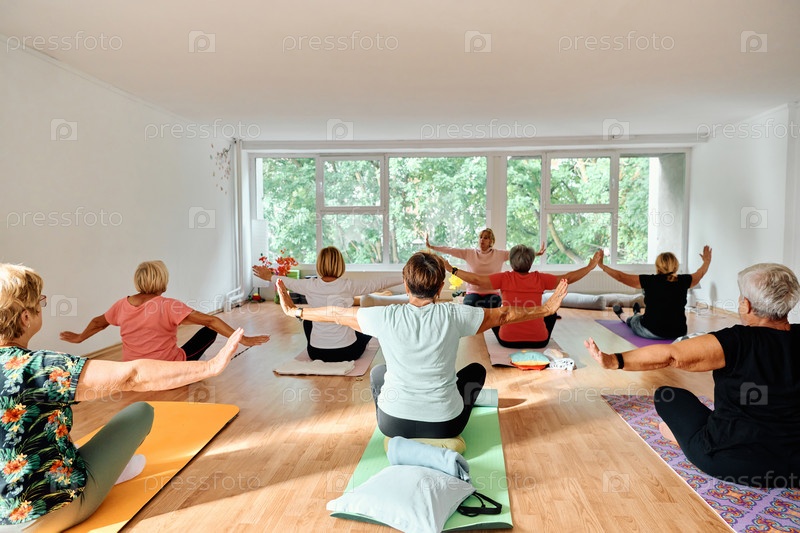 Группа пожилых женщин занимается различными упражнениями йоги, включая растяжку шеи, спины и ног, под руководством тренера в залитом солнцем месте, способствуя благополучию и гармонии