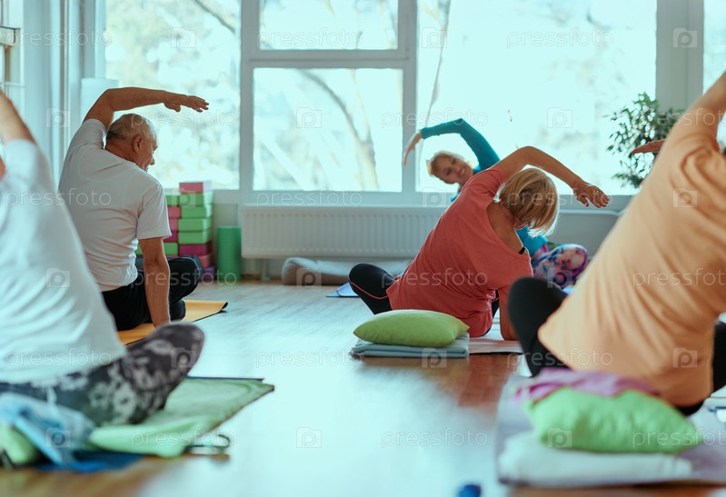 Женщины старшего возраста занимаются оздоровлением: йогой и растяжкой в залитом солнцем пространстве