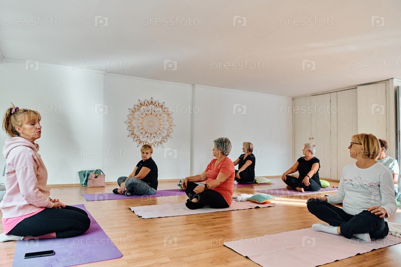 Группа пожилых женщин занимается различными упражнениями йоги, включая растяжку шеи, спины и ног, под руководством тренера в залитом солнцем помещении, способствуя благополучию и гармонии