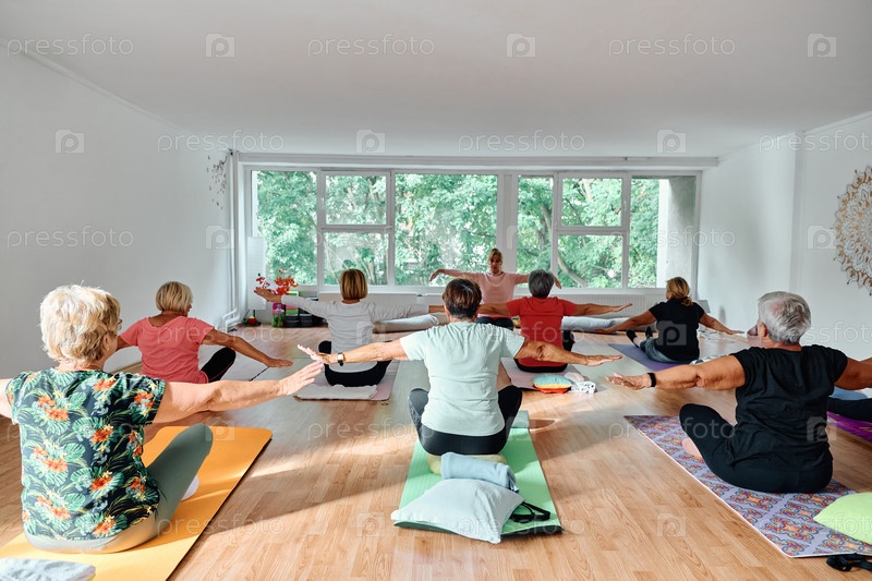 Группа пожилых женщин занимается различными упражнениями йоги, включая растяжку шеи, спины и ног, под руководством тренера в залитом солнцем месте, способствуя благополучию и гармонии