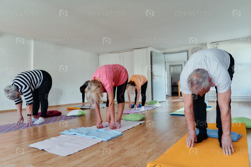 Пожилые мужчина и женщина вместе выполняют упражнения на растяжку спины, чтобы поддерживать здоровый и активный образ жизни