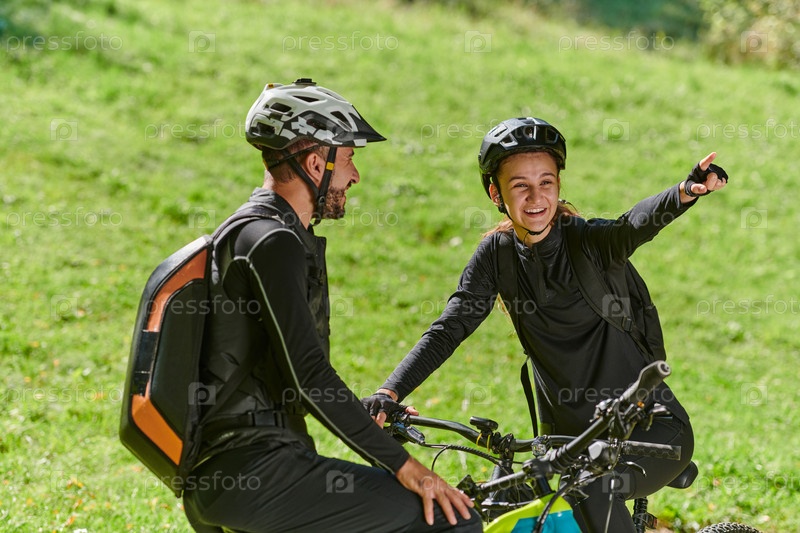 Милая парочка, вооруженная велосипедами и поглощенная планированием своего путешествия, проверяет свои мобильные телефоны и часы, планируя живописные маршруты в парке, органично сочетая технологии и приключения на свежем воздухе для восхитительного опыта