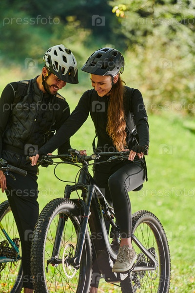Милая парочка, вооруженная велосипедами и поглощенная планированием своего путешествия, проверяет свои мобильные телефоны и часы, планируя живописные маршруты в парке, органично сочетая технологии и приключения на свежем воздухе для восхитительного опыта