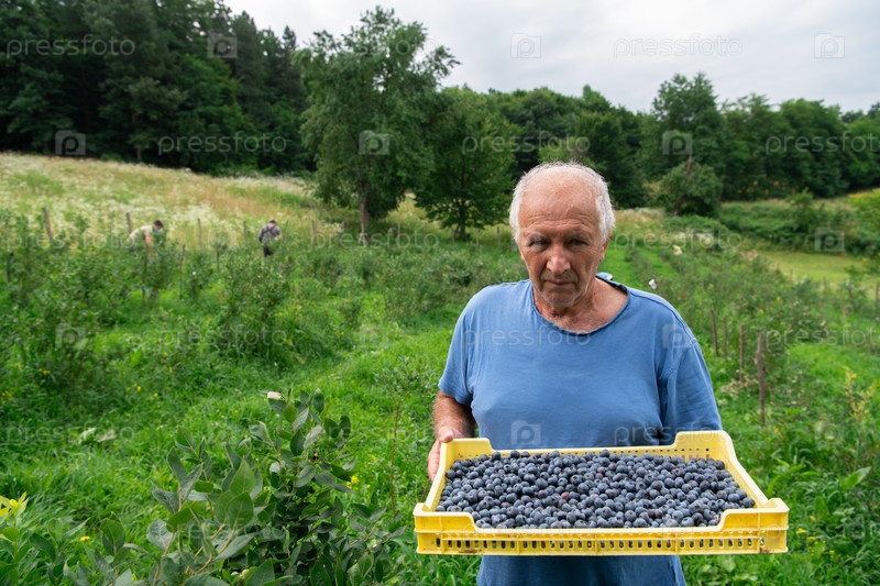 Пожилой фермер несет корзину свежесобранной черники со своей фермы