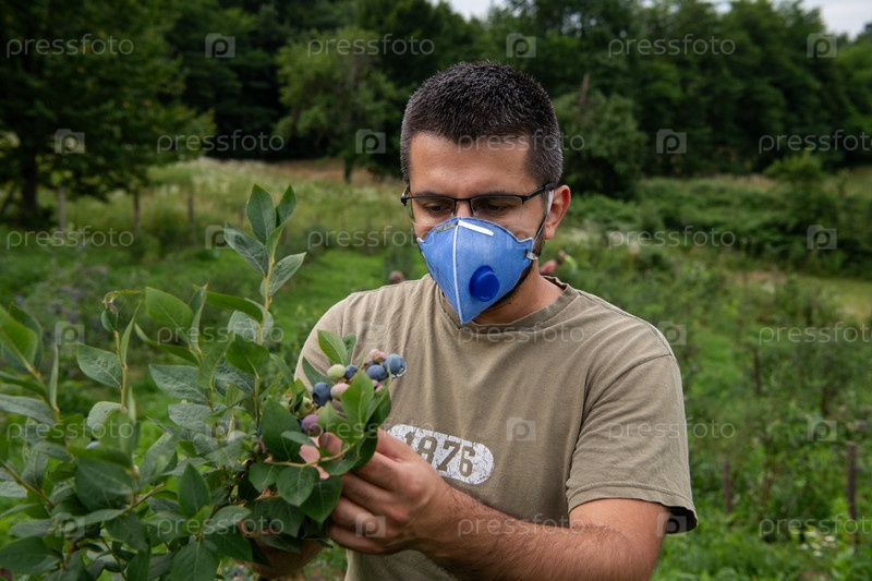 Фермер в защитной маске проверяет качество черники и наличие вредителей на своей небольшой ферме