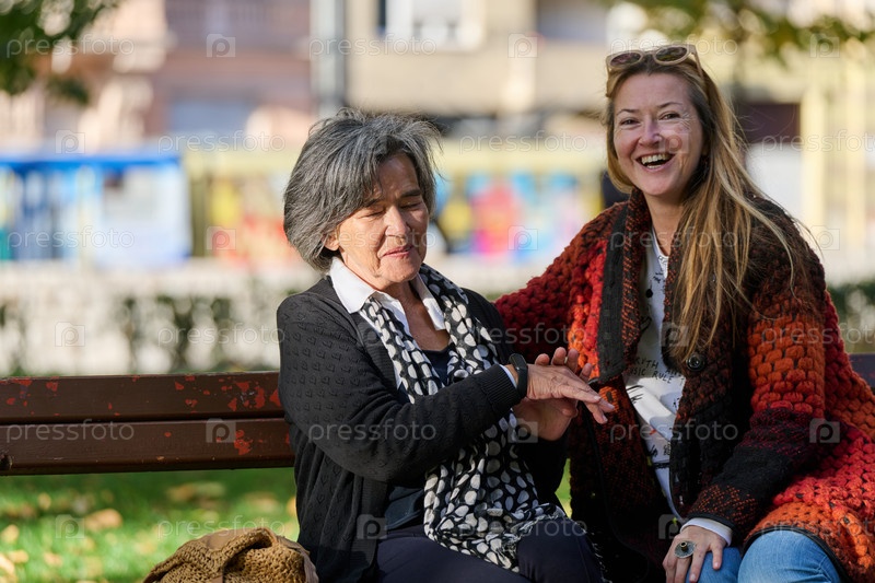 Обнимая поколения: любовь и поддержка дочери для ее пожилой матери в солнечный день в парке