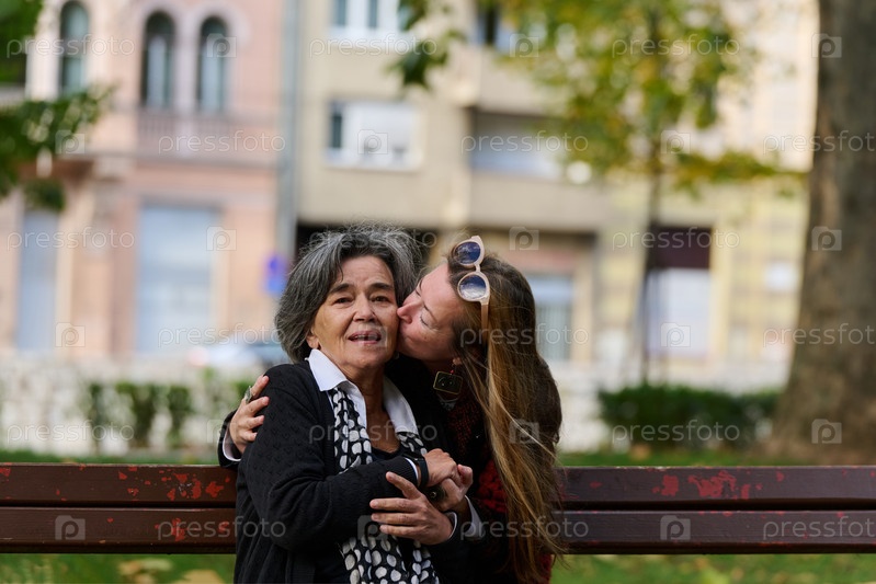 Обнимая поколения: любовь и поддержка дочери для ее пожилой матери в солнечный день в парке