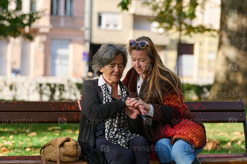 Обнимая поколения: любовь и поддержка дочери для ее пожилой матери в солнечный день в парке
