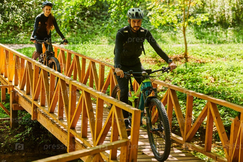 Счастливая пара, одетая в профессиональную велосипедную экипировку, наслаждается романтической велопрогулкой по парку, окруженному современными природными достопримечательностями, излучая любовь и счастье