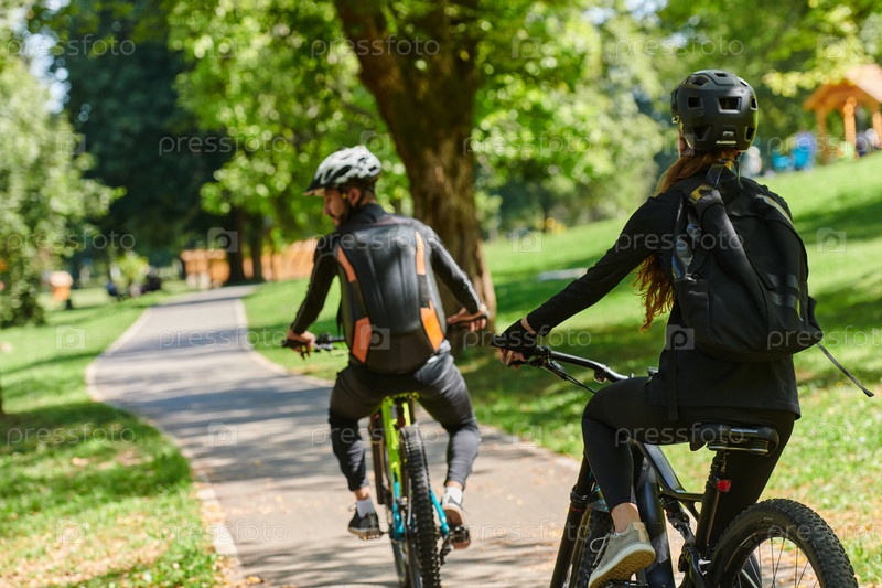 Счастливая пара, одетая в профессиональную велосипедную экипировку, наслаждается романтической велопрогулкой по парку, окруженному современными природными достопримечательностями, излучая любовь и счастье