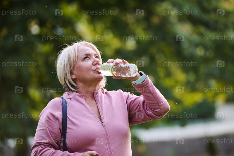 Пожилая женщина пьет воду после тяжелой тренировки на природе