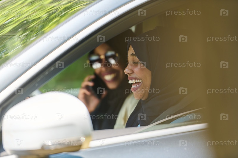 Две мусульманки в хиджабах разговаривают по смартфону, путешествуя вместе в машине по