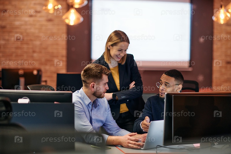 Стратегическая бизнес-встреча: группа профессионалов, работающих в офисе с использованием компьютеров