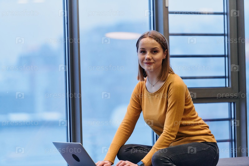 Деловая женщина пользуется ноутбуком, сидя у окна большого корпоративного здания, на фоне которого открывается живописный вид на городской пейзаж