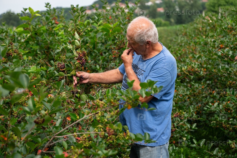 Старший фермер тщательно осматривает свою ягодную ферму, чтобы убедиться в качестве и прогрессе