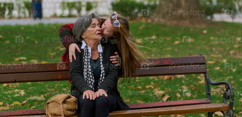 Обнимая поколения: любовь и поддержка дочери для ее пожилой матери в солнечный день в парке
