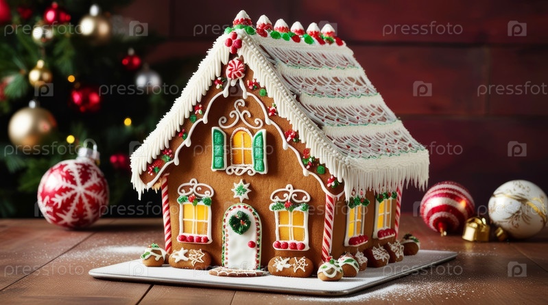 Празднично украшенный пряничный домик, украшенный разноцветной глазурью и сладостями