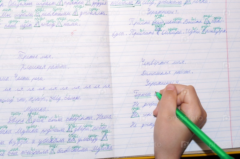 Ребенок подписывает зеленой ручкой часть речи над подлежащим в тетрадке по русскому языку