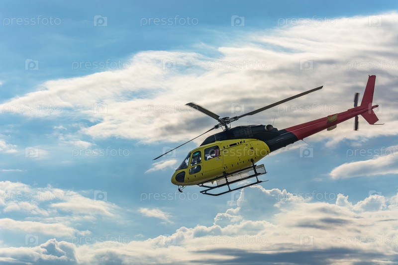 Транспортный вертолет парит над горной местностью на закате, эффектное освещение подчеркивает элегантный дизайн и вращающиеся лопасти винта