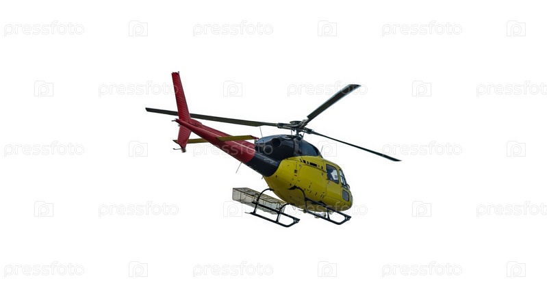 Транспортный вертолет завис на белом фоне. Обтекаемый дизайн и вращающиеся лопасти
