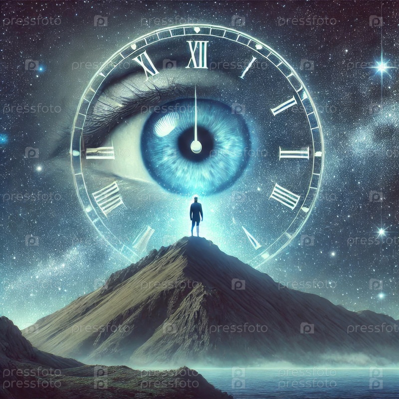 Сюрреалистическая космическая сцена с часами и человеком на вершине горы