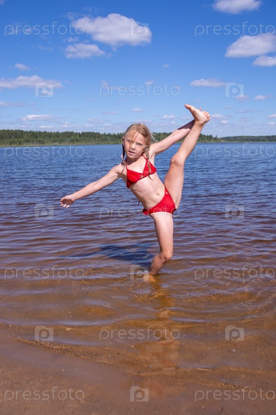В жаркий летний день ребенок отдыхает на озере. Девочка на пляже. Девушка плавает на надувном розовом фламинго. В знойный летний день ребенок расслабляется на озере. Девушка на пляже. Девушка плывет на надуваемом розовом фламинго