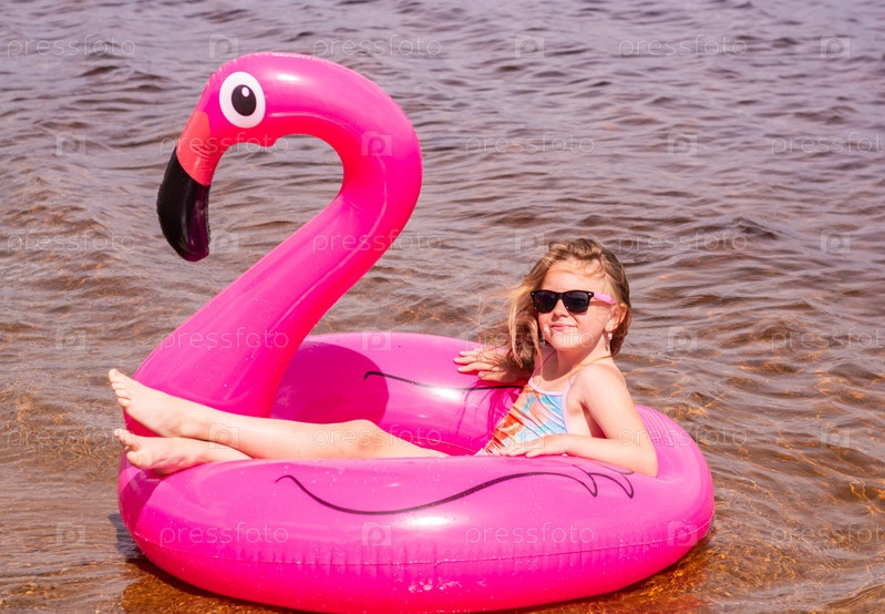 В жаркий летний день ребенок отдыхает на озере. Девочка на пляже. Девушка плавает на надувном розовом фламинго. В знойный летний день ребенок расслабляется на озере. Девушка на пляже. Девушка плывет на надуваемом розовом фламинго