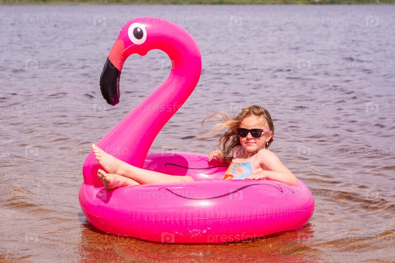 В жаркий летний день ребенок отдыхает на озере. Девочка на пляже. Девушка плавает на надувном розовом фламинго. В знойный летний день ребенок расслабляется на озере. Девушка на пляже. Девушка плывет на надуваемом розовом фламинго